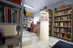 Depois, o mesmo espaço virou Brechoteca, uma mistura de biblioteca com brechó. Com a venda de itens diversos, inclusive eletrodomésticos, as estantes eram alimentadas com mais livros. Quem estava à frente da biblioteca popular era a coletiva “Achadouras de Histórias”, que decidiu honrar a memória de Djeanne, frequentadora do local, emprestando seu nome ao espaço.