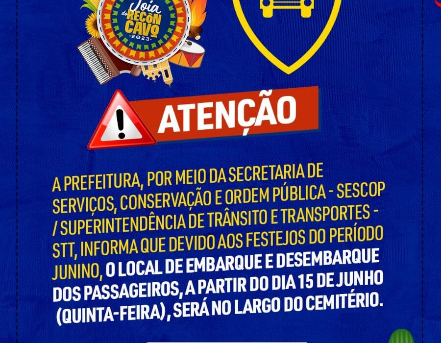 A Prefeitura, por meio da Secretaria de Serviços, Conservação e Ordem Pública – SESCOP / Superintendência de Trânsito e Transportes – STT, informa que devido aos festejos do período junino, o local de embarque e desembarque dos passageiros, a partir do dia 15 de junho (Quinta-feira), será no Largo do Cemitério.